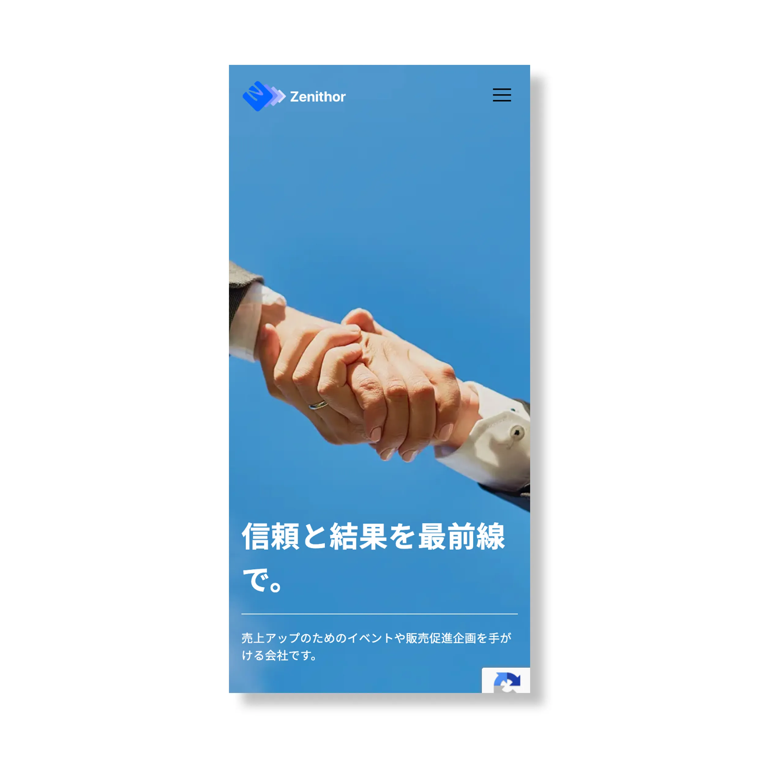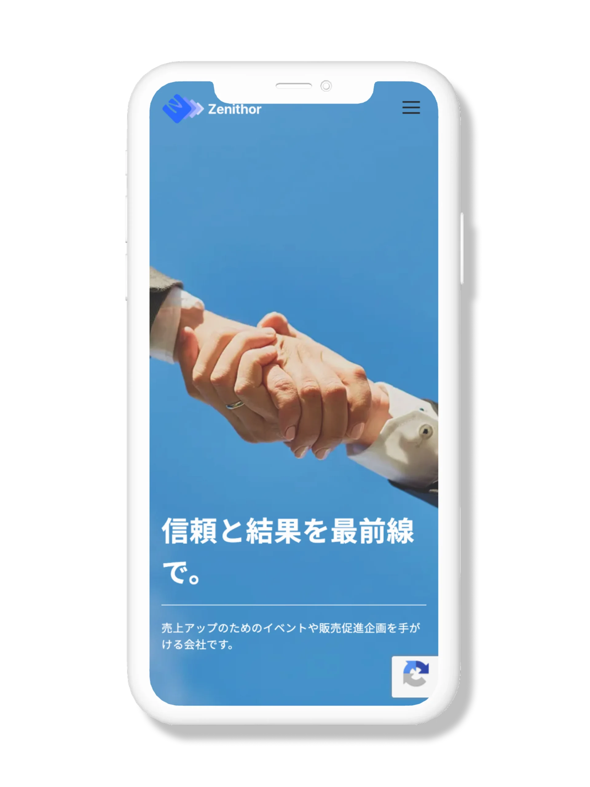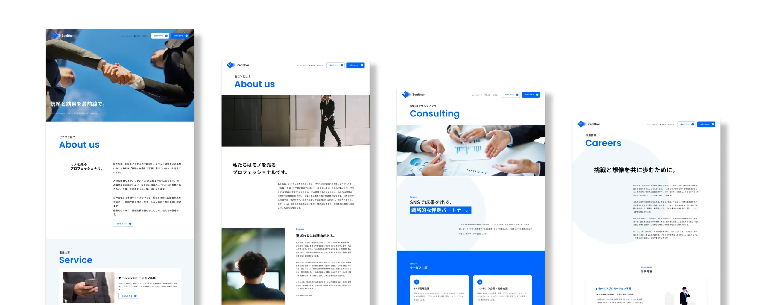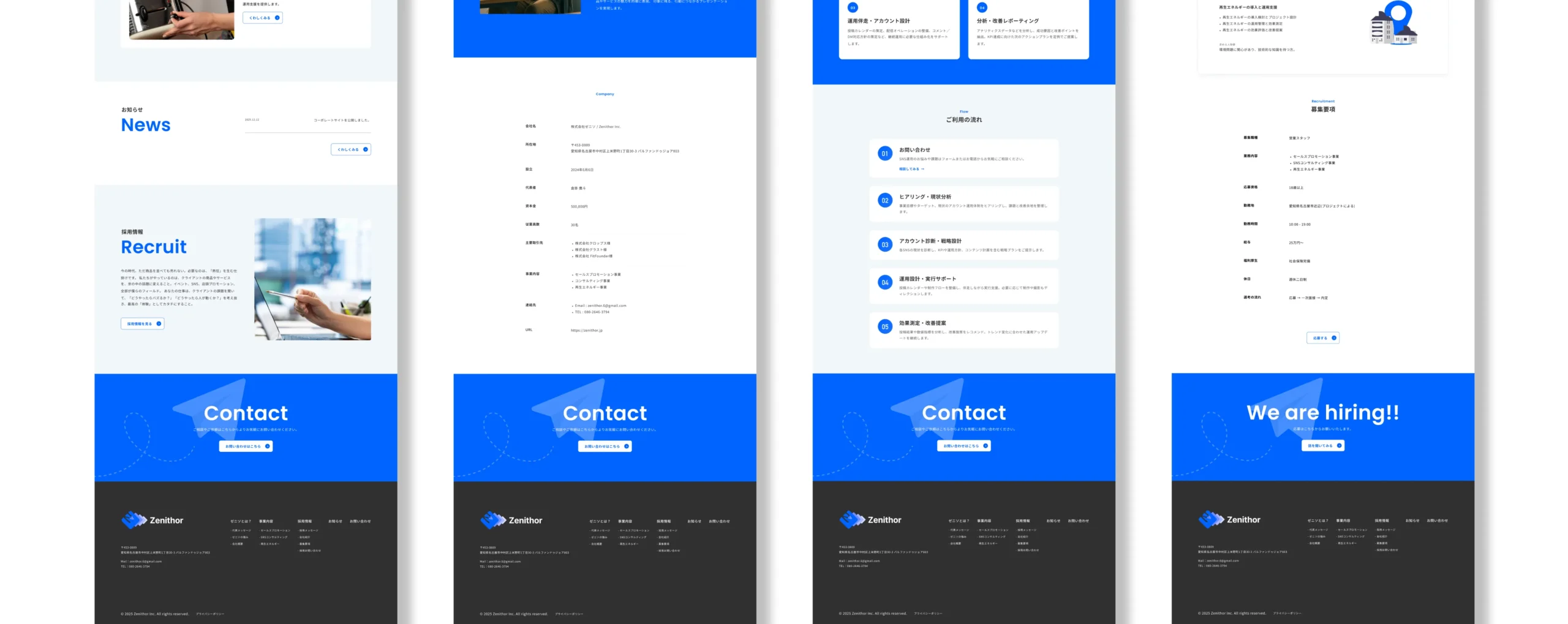 株式会社zenithor様のロゴ制作と並行して、コーポレートサイトの制作も担当させていただきました。営業活動の中で会社の説明をする機会が多いというお話を伺い、今回のコーポレートサイトは「営業ツールとして使いやすいサイト」であることを一つの目的として設計しました。